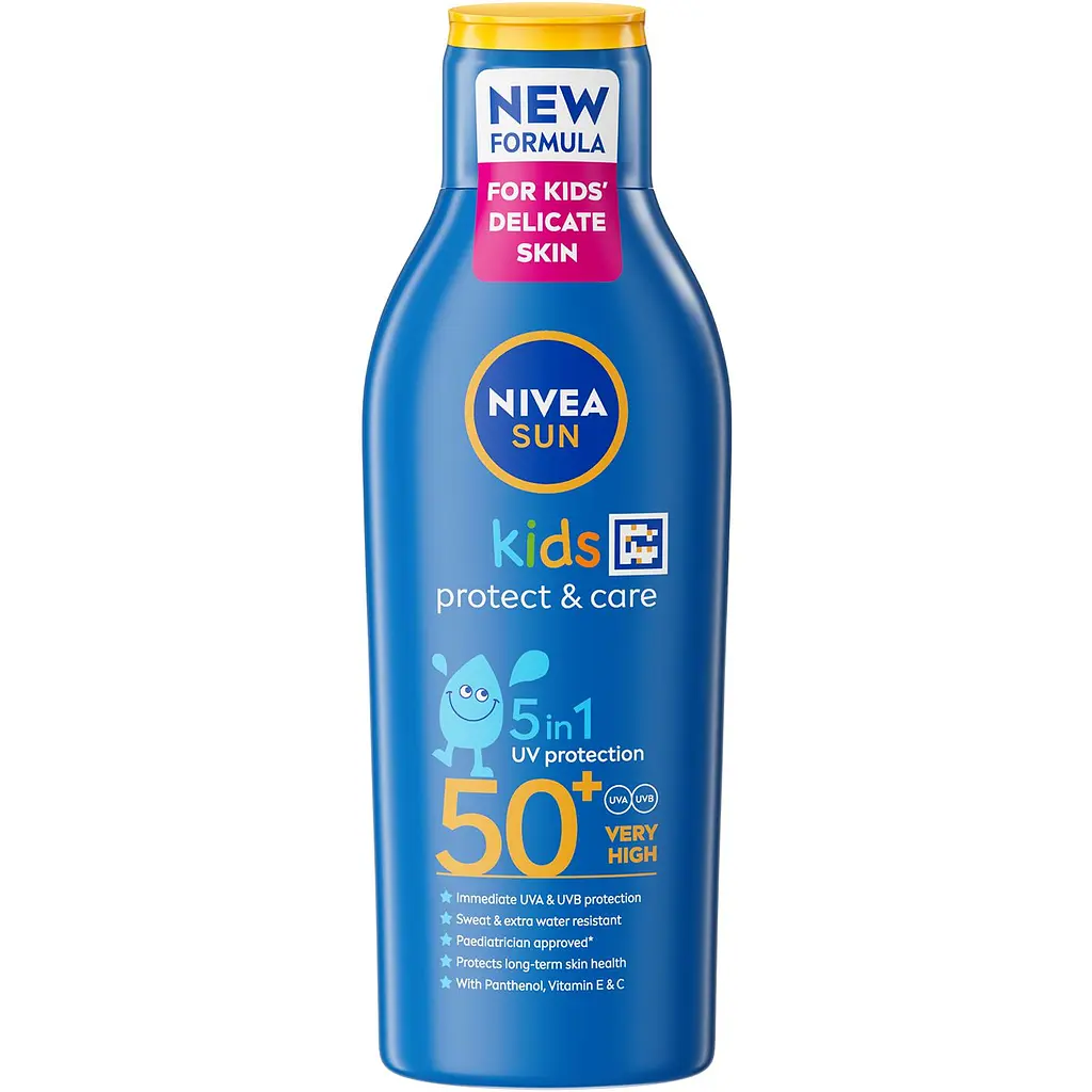 Детский солнцезащитный лосьон Nivea Sun Kids - защита от солнца 5 в 1, которая мгновенно защищает детскую кожу от солнечных ожогов и предотвращает обезвоживание кожи. Педиатрическая одобренная водостойкая формула.