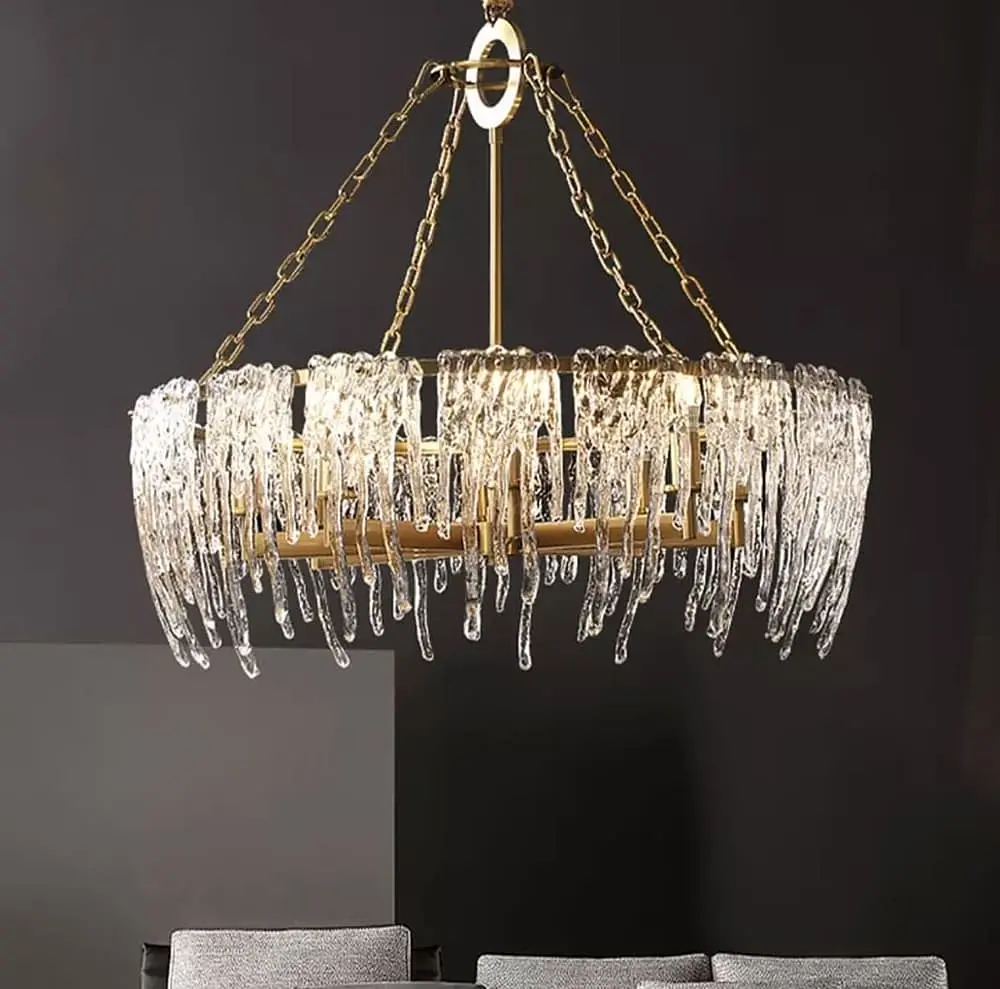 Дизайнерская люстра с прозрачными стеклянными подвесными пластинами - это настоящее произведение искусства, сочетающее элегантность и загадочность. Ее высокий металлический каркас бронзового оттенка удерживает прозрачные хрустали, свисающие, словно подсвеченные сталактиты ледниковой пещеры, придавая композиции особый шарм и изящество. Свет, излучаемый лампами, мягко и равномерно рассеивается, создавая мягкое, многогранное освещение и превращая любой интерьер в атмосферную среду. В сочетании с изящными цепочками, дополняющими композицию, эта люстра станет ярким акцентом вашего пространства. Модель доступна в трех вариантах: 60 см - 6 ламп 80 см - 8 ламп 100 см - 10 ламп Цоколь E14 дает возможность выбора освещения под ваши потребности, а высота люстры регулируется благодаря цепочкам, что добавляет возможности для адаптации под любые помещения. Цвет основы: 100 Форма_изделия: Круг Тип помещения: Люстры для гостиной (в зал) Серия: d 1522 Максимальная высота: 145 см Минимальная высота: 73 см Тип цоколя: E14 Цвет хрусталя: Прозрачный Размер монтажной планки: 8 см Тип крепления: Монтажная планка Количество источников света: 10