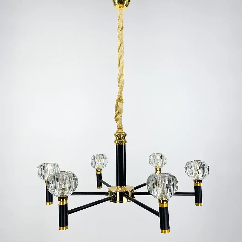 Элегантная подвесная люстра представлена в двух вариантах: одноярусная на 6 плафонов (диаметр 60 см) и двухъярусная на 12 плафонов (диаметр 80 см). Модель на 6 плафонов идеально подходит для спальни, прихожей или обеденной зоны (10-12 м²), а вариант на 12 плафонов - для гостиной, просторной столовой или ресторана (20-25 м²). Особенностью люстры является соединение черного металлического корпуса с золотой фурнитурой. Стеклянные плафоны имеют граненую форму, напоминающую драгоценные камни, создавая роскошный световой эффект. Цоколь G9 в комплекте LED-лампы мощностью 2 Вт. Высота регулируется от 40 до 85 см, что делает светильник универсальным. Благодаря стильному дизайну, эта модель прекрасно дополнит современный, арт-деко или неоклассический интерьер. Мощность (Вт): 60 Серия: H 9860 Цвет основы: Черный Цвет плафона: Прозрачный Цвет фурнитуры: Золотий Максимальная высота: 85 см Минимальная высота: 40 см Тип цоколя: G9 Размер плафона: 7х8 см Материал основы: Металллл Размер монтажной планки: 10х12 см Тип крепления: Крючок Количество источников света: 6
