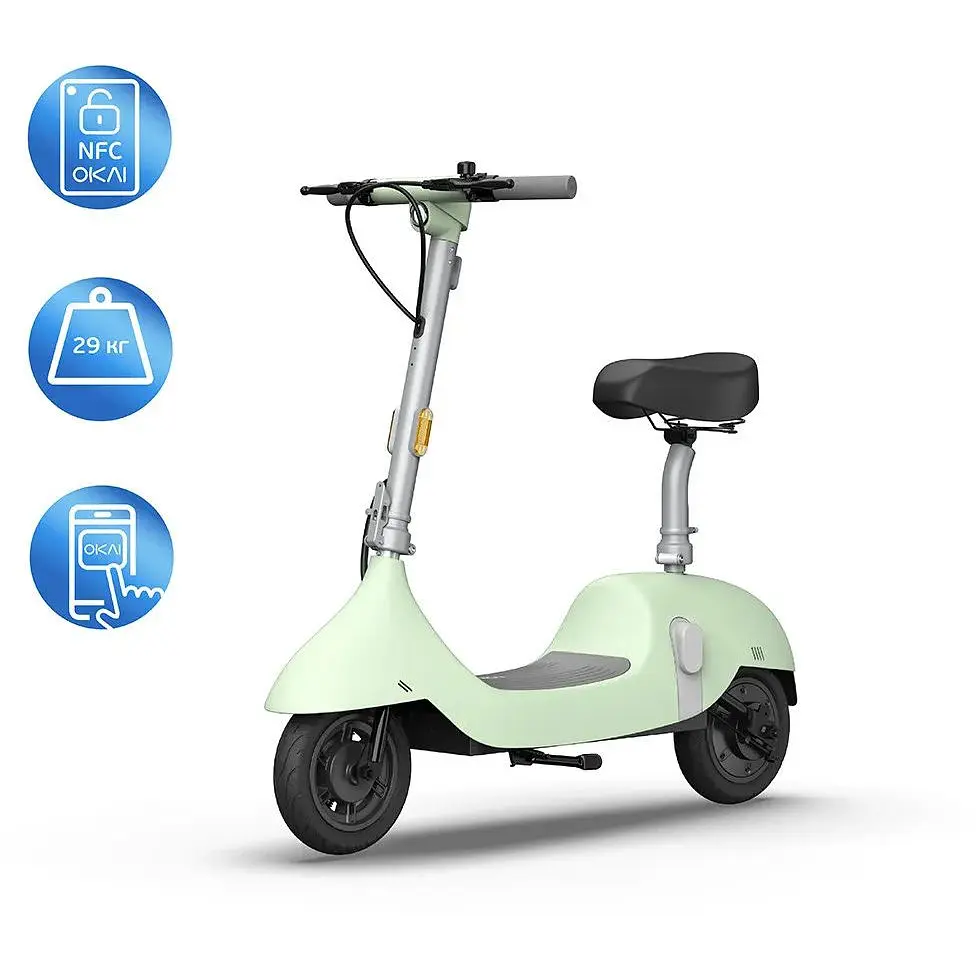 До конца акции 155 днейOKAI Ceetle Pro EA10C разработан в стильном ретро-дизайне. Эргономичное сиденье с возможностью регулировать высоту обеспечит комфорт в ежедневных поездках на работу и во время прогулок по городу. ДО 56 КМ НА ОДНОМ ЗАРЯДЕ Электросамокат имеет бесщеточный двигатель мощностью 900 Вт и аккумулятор емкостью 10,4 Ач. Он способен разгоняться до 25 км/час. А одного заряда хватит, чтобы проехать до 56 км. Максимальный угол подъема составляет 20°, поэтому холмы — не проблема для OKAI Ceetle Pro EA10C. СИДЕНЬЕ ДЛЯ УДОБНЫХ ПОЕЗДОКМодель оснащена мягким сиденьем, которое можно регулировать по высоте. Теперь можно ездить не только стоя, но и сидя. Прогулки по городу еще никогда не были такими комфортными!ИННОВАЦИОННЫЕ ТЕХНОЛОГИИИнформативный дисплей показывает скорость езды и заряд аккумулятора. Чтобы начать поездку, достаточно поднести NFC-карту. Специальное приложение, доступное как для Android, так и для iOS, позволяет настроить единицы измерения (мили или км) и персонализировать режимы движения. Также в приложении можно посмотреть статистику своих поездок. БЕЗОПАСНАЯ ЕЗДАМеханическая и электронная тормозная система обеспечивают безопасность торможения. Яркие передние и задние светодиодные фары и боковые отражатели делают этот самокат безопасным выбором для езды в пробках и ночью. Передняя фара способна освещать путь на 35 м вперед. ИДЕАЛЬНЫЙ ВЫБОР ДЛЯ ВЗРОСЛЫХ И ПОДРОСТКОВМодель имеет большие 10-дюймовые колеса с вакуумными шинами. Корпус электросамоката OKAI Ceetle Pro EA10C изготовлен из алюминиевого сплава. Электротранспорт способен выдерживать до 100 кг и подходит для людей ростом до 2-х метров. КОМПАКТНЫЙ И УДОБНЫЙМодель быстро складывается и занимает минимум места. Ее легко разместить в багажнике для транспортировки. Съемный аккумулятор можно заряжать где угодно. Всего 4-6 часов, и электросамокат снова готов к приключениям!