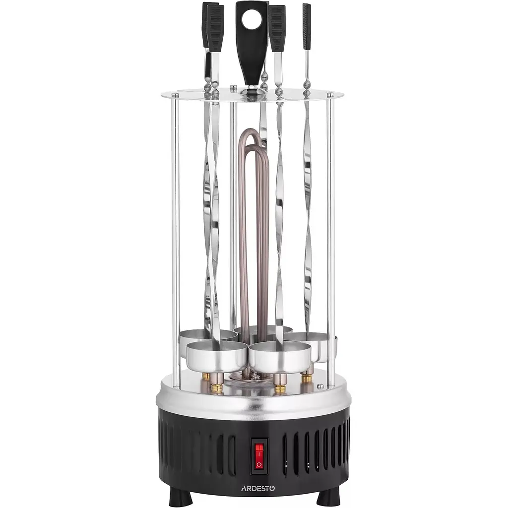 Пять вращающихся шампуров. Конструкцией предусмотрена возможность приготовления одновременно на пяти шампурах из нержавеющей стали, вращающихся вокруг своей оси на 360°, поэтому блюда будут обжариваться равномерно и не будут пригорать. Используя VEG-HY1000 бренда Ardesto, можно готовить не только шашлык, но и запекать сосиски, креветки, грибы или овощные миксы.