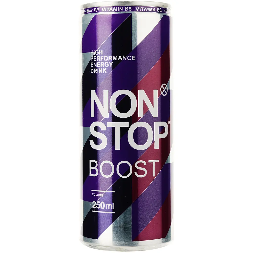 Non Stop Boost — це класичний енергетичний напій, який чудово підходить для підзарядки енергією під час напруженого дня або перед фізичною активністю. Напій має приємний солодкуватий смак із традиційними енергетичними нотками та яскравий аромат. Завдяки вмісту кофеїну, таурину та вітамінів групи B, він допомагає підвищити концентрацію та бадьорість. Компактний формат 250 мл зручний для швидкого споживання в дорозі чи на роботі, а ефект бадьорості відчувається досить швидко.