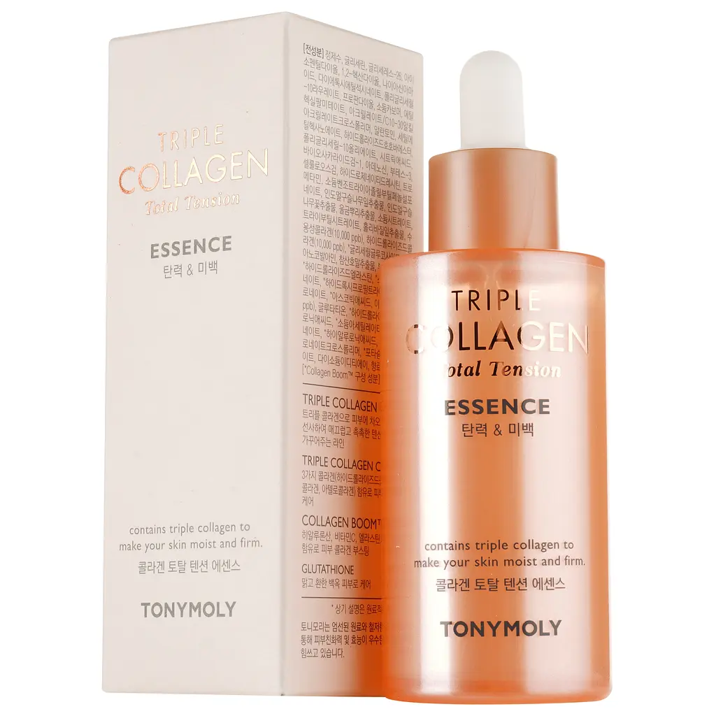 Эссенция для лица Tony Moly Triple Collagen Total Tension Essence увлажняет и отбеливает кожу благодаря тройной формуле с добавлением коллагена, ниацинамида и витамина С. Помогает восстановить упругость кожи благодаря своей запатентованной формуле Collagen Boom. Увлажняет и успокаивает кожу с помощью аквапорина и комплекса Moist-7. Состоит из веганского коллагена, ферментируемого дрожжами вместо животных ингредиентов. Богатая текстура, питающая кожу.