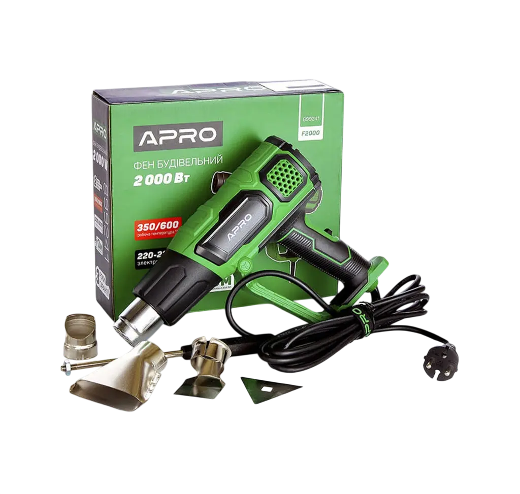 Фэн строительный Apro F2000 – это электронагревательный прибор широкого применения, предназначенный для тепловой обработки разных поверхностей и деталей путем обдува потоком нагретого воздуха. Данная модель имеет отличный функционал, благодаря чему решает задачу в удалении краски, лака, следов пайки, отлично уберет остатки клея из панелей, мебели, окон, дверей и т.д., проведет продувку и сушку поверхностей, используется в разного рода работах, где требуется локальный нагрев.