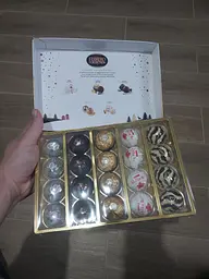 Відкриваєш — і відразу святковий настрій, а не просто коробка шоколаду. У наборі п’ять видів по чотири штуки, тож вибір є, і кожен може знайти свій фаворит. Смаки не штовхають тебе на гастрономічні екстреми, але й не нудні: кокос, темний шоколад, горіх, кавова нотка — усе збалансовано, без зайвої солодкості чи нав’язливих ефектів.