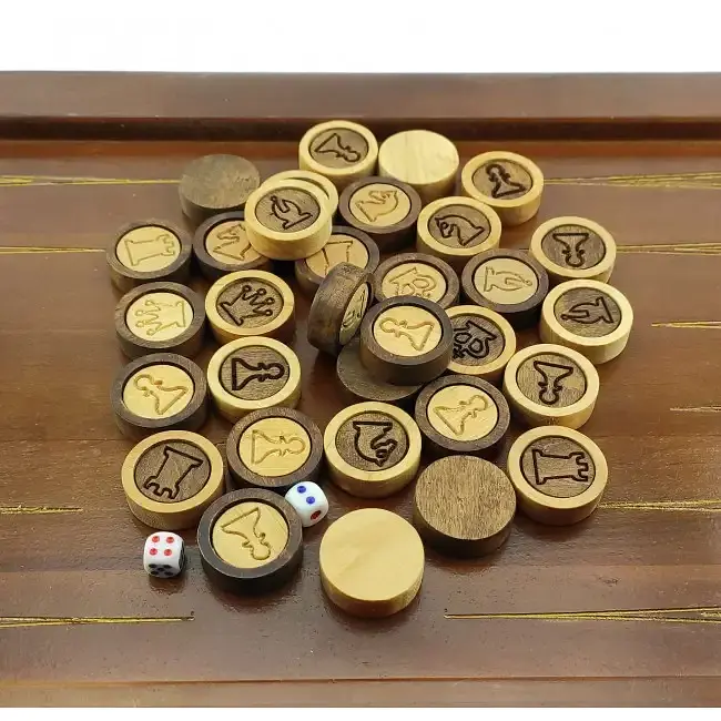 Фишки для нард, с изображением шахматных фигур, шашки, массив дерева, 32 шт. в наборе, покрыты паркетным маслом, отлично подходят для игр 3 в 1. Подарочный мешочек из органзы на затяжках, цвет золотистый, 17×23 см.