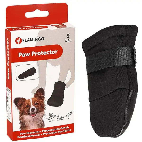 Flamingo Paw Protector S – защитная обувь для собак пород мопс, такса, пудель (породы указаны ориентировочно). Используется для травмированной лапы собаки в качестве бережной защиты от грязи, воды, песка и других источников инфекции. Помогает ускорить заживление после операции. Амортизирует давление на больную лапу от грунта, гравия и других поверхностей.