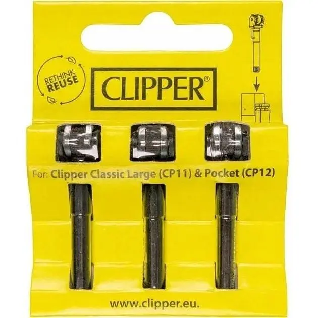 Флинт система Clipper 3шт. Сменная флинт-система, которая предназначена на случай потери или поломки имеющейся. Стержень включает в себя кремний и колесико. Подходит для всех зажигалок бренда Clipper стандартного размера. В комплекте 3 стержня, Made in Spain.