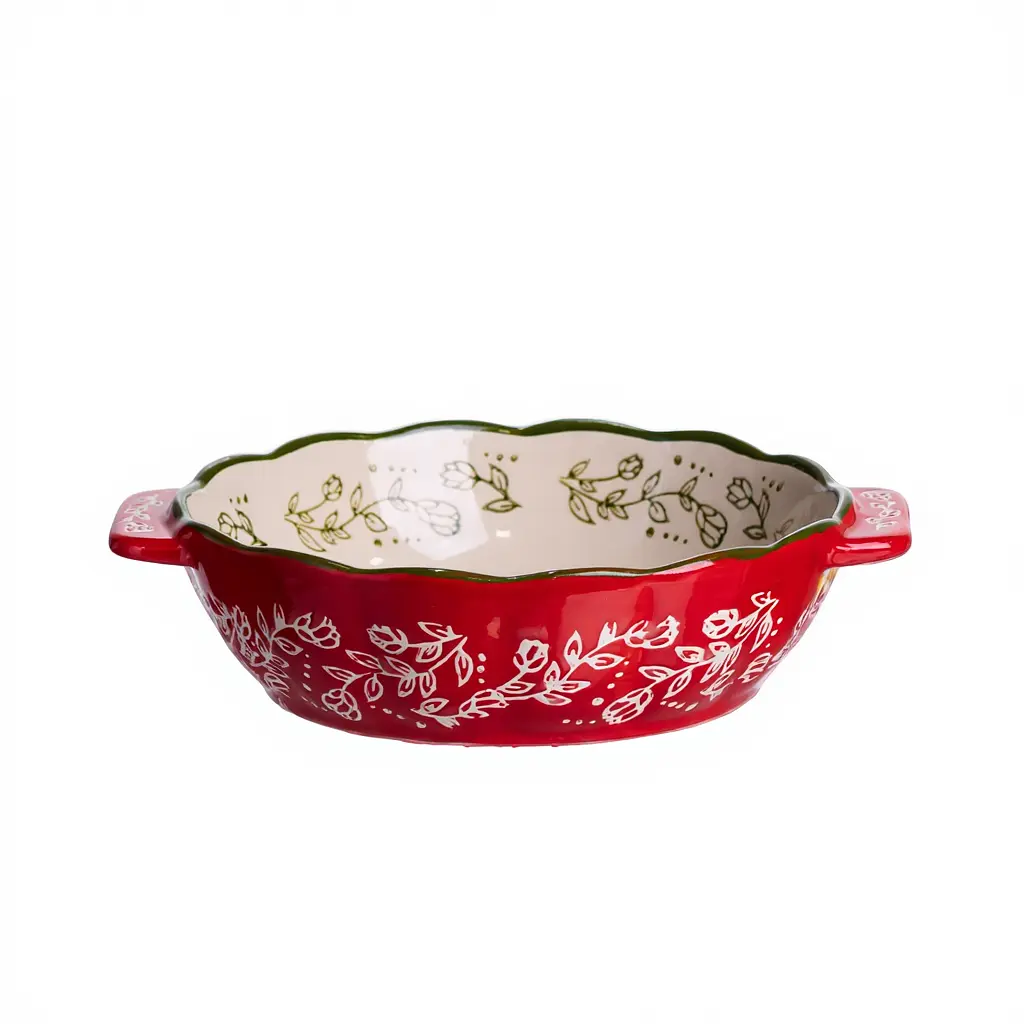 Фарфоровая форма для запекания предназначена для тех, кто ценит удобство и красоту на кухне. Ее стильное оформление с насыщенным красным цветом и нежным растительным орнаментом делает подачу особенно эффектной.