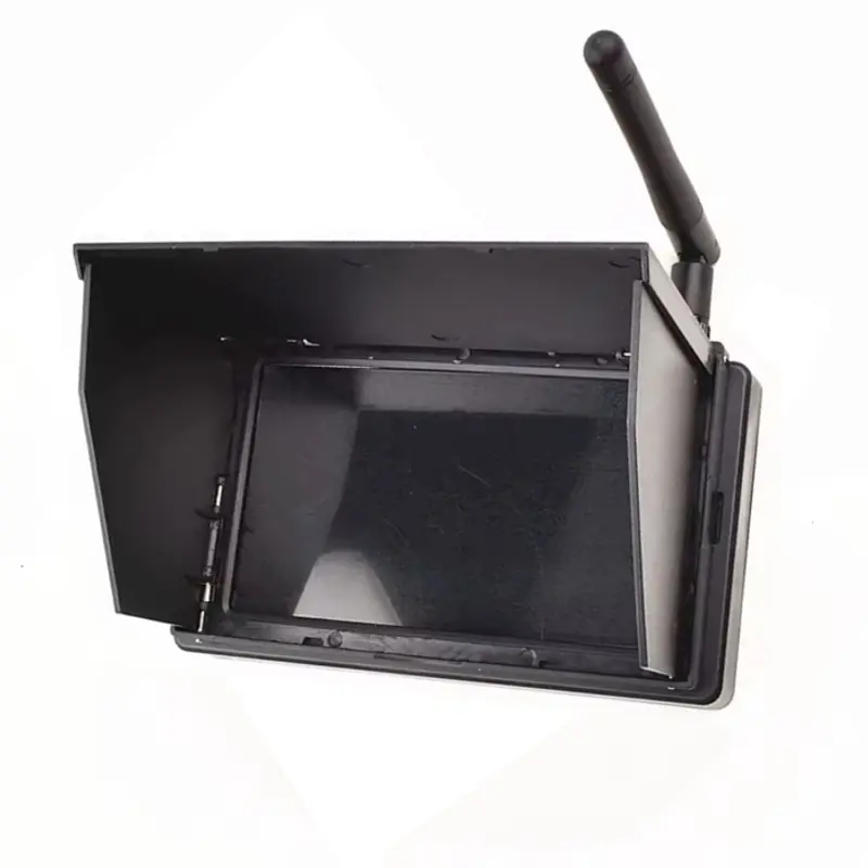 FPV монитор поддерживает 40 частотных каналов с поддержкой Raceband. Выбор активного канала может осуществляться в автоматическом или ручном режимах. На экране отображается номер канала, частота канала, остаток заряда батареи и уровень видеосигнала. В комплекте есть всенаправленная антенна. Солнцезащитная шторка может складываться и раскладываться. Основные особенности