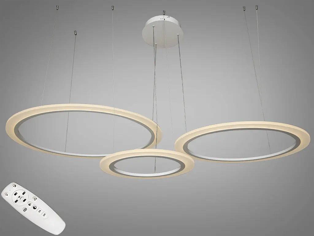 Светодиодные светильники «кольца» всегда будут в центре вашего внимания. Ведь за счёт регулировки шнура вы можете подвесить кольца по-разному, создавая свою личную композицию. Перед Вами совсем новое и необычное исполнение плафонов, обрамляющих LED лампы. Такая люстра запросто подойдет под любой интерьер – классический, современный и даже в стиле «хай-тек». В комплекте с люстрой идёт самый современный тип пульта с электронным диммером и регулятором цвета. С пульта можно включить один из предустановленных режимов освещения - тёплый свет, холодный свет, нейтральный; включить режим "ночник" (люстра будет включена всего на 5% мощности LED-люстры), уменьшить или увеличить яркость на 50%, а если всего этого покажется мало - плавно отрегулировать уровень яркости и цветовую температуру. С выключателя люстра переключается как и любая другая светодиодная люстра. Каждое включение выключение поочередно переводит люстру по следующим режимам: холодный свет, тёплый свет, нейтральный свет. 9079