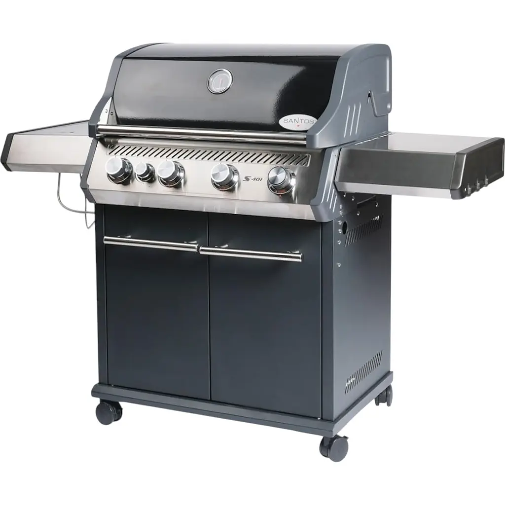 Газовый гриль Santos S-401 выполнен в корпусе черного цвета со вставками и боковыми столиками из нержавеющей стали. Имеет большую площадь для приготовления, оснащен четырьмя основными горелками и горелкой в левом боковом столике. Отлично подойдет для приготовления на большую компанию из 8-12 человек и позволит приготовить практически любые блюда BBQ.