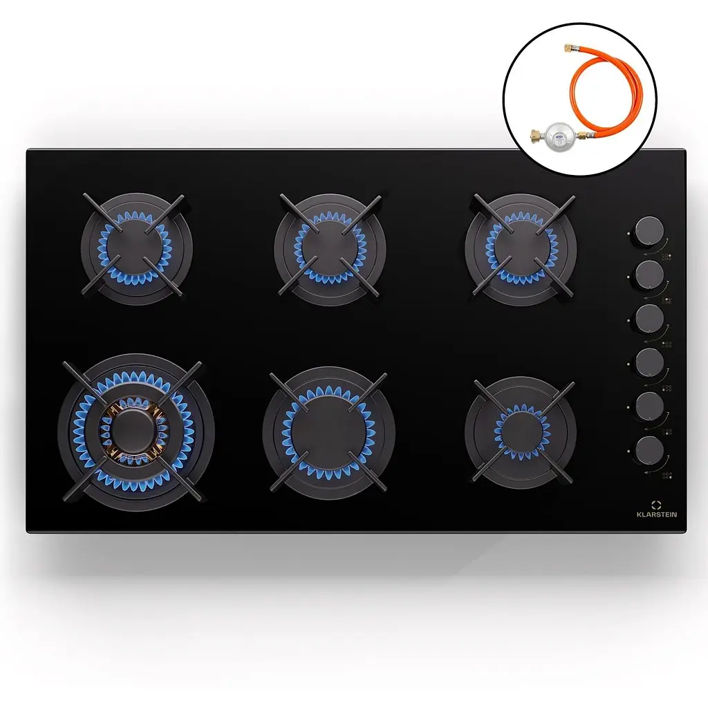 Для взыскательных поваров Klarstein представляет газовую варочную панель Goldflame 6 , которая сочетает в себе преимущества газовой плиты с эффективностью, управляемостью и экологичностью. Благодаря шести высококачественным латунным конфоркам (3,4 кВт, 2 x 2,4 кВт, 2 x 1,8 кВт, 1,0 кВт) эта компактная варочная панель обеспечивает оптимальный нагрев. Долговечность конфорок и равномерное распределение тепла подчёркивают высокое качество изготовления. Прочные чугунные крестовины обеспечивают надёжную установку различной посуды.