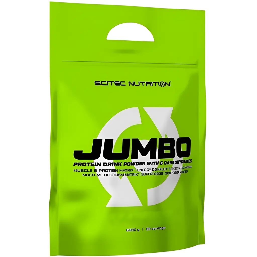 Scitec Nutrition Jumbo - мощнейший гейнер, вызвавший революцию на рынке спортивного питания. Этот гейнер отлично подходит как профессионалам, так и любителям бодибилдинга. Данный продукт обеспечивает организм спортсмена необходимым количеством калорий (808 ккал на порцию), белков (50 гр качественной протеиновой смеси на порцию), а также имеет в своем составе продвинутую углеводную матрицу, питающую ваши мышцы на протяжении всего дня. Кроме того, в состав Jumbo включены такие последние разработки от компании Scitec, как специальные запатентованные анаболическая и креатиновая матрицы.