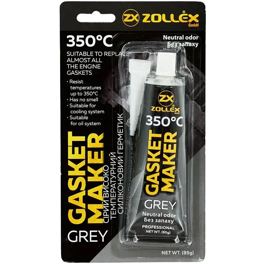 Многоцелевой прокладочный герметик Zollex Grey серого цвета разработан для ремонта или замены всех автомобильных прокладок, заполняет зазоры до 6 мм. Отлично выдерживает растяжение, смещение и сжатие. Может применяться в местах, где будет непосредственный контакт с маслом, водой, антифризом, тормозной жидкостью и бензином.