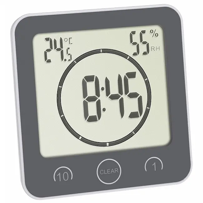Виробник: TFA Dostmann GmbH & Co.KG, Germany Особливості: Годинник для ванної кімнати/кухні Індикація температури та вологості у приміщенні Таймер до 99 хвилин, круговий індикатор показує як плине час З підвісним пристроєм та настільною підставкою Присоска для легкого встановлення на плоскі поверхні Із захистом від бризок Коли справа доходить до ранкового душу чи приготування, кожна хвилина на рахунку. З цим годинником для ванної кімнати/кухні від TFA ви отримуєте не тільки поточний час, а й функцію таймера. Таймер можна встановити до 99 хвилин, і він охоплює все, від чищення зубів до випікання тортів. Хід часу можна спостерігати за круговим графіком. Присоска на задній панелі забезпечує надійну фіксацію на плитці, дзеркалі або на інших плоских поверхнях без свердління отворів. Крім того, цей вологостійкий годинник можна повісити на стіну за допомогою отвору для підвішування. Вбудований термогігрометр вимірює температуру та вологість у приміщенні, тому ви завжди можете стежити за мікрокліматом у приміщенні. Якісний продукт від TFA Dostmann GmbH & Co.KG, Germany