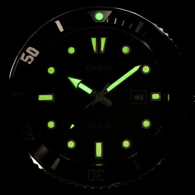 Подсветка-часы Casio MDV-107-1A1VEF обладают аналоговой индикацией. Часовая, минутная и секундная стрелки. Стрелки и метки имеют необритовое светонакопительное покрытие. Это обеспечивает длительную подсветку в темное время суток, даже после короткого воздействия света.