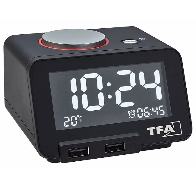 Виробник: TFA Dostmann GmbH & Co.KG, Germany Особливості: Великий РК-дисплей з 4 рівнями яскравості Просте налаштування часу з диском, що обертається Функція заряджання для мобільних пристроїв через два порти USB (макс. 2 А) Мелодія будильника з регульованою гучністю Будильник із функцією повтору Температура у приміщенніПідставка з 2 гумовими накладками Дуже стильний зовнішній вигляд Настільна установка Адаптер живлення у комплекті Цей високоякісний цифровий будильник вражає великим, висококонтрастним РК-дисплеєм та зручним налаштуванням. У той же час, у вас є можливість заряджати мобільні пристрої на ніч за допомогою двох USB-портів. Що ще хочете від будильника? Годинник і час будильника можуть бути скориговані за допомогою великої ручки, що обертається, зверху. Ви обов'язково прокинетеся з дружньою та своєчасною мелодією, а завдяки функції повтору ви можете поспати кілька додаткових хвилин. Гучність будильника можна регулювати за необхідності. Вбудований термометр вимірює температуру в приміщенні та забезпечує гарний клімат у спальні. Для хорошого нічного сну температура не повинна перевищувати 18 °C або опускатися нижче 16 °C.