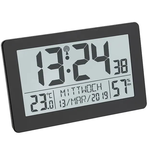 Виробник: TFA Dostmann GmbH & Co.KG, GermanyОсобливості:Дуже чітко відображені дні тижня, написані повними літерами (7 мовами), та повністю датаВисокоточний радіокерований годинникЗ часовим поясом та можливістю ручного налаштуванняВнутрішня температура та вологістьДва будильникиРегульоване спрацювання будильника (щодня, у будні, у вихідні)Функція повтору з регульованим інтерваломПідсвічуванняНастінне або настільна установкаЦей радіокерований годинник від TFA вражає своїм чітким впорядкованим дисплеєм. Дисплей також легко читається на відстані і особливо підходить для зони входу або приймальні, кімнати очікування та офісу. На додаток до дати з повним днем тижня також відображаються температура та вологість у приміщенні. Таким чином, ви можете забезпечити приємний клімат у ваших житлових та робочих приміщеннях. Час встановлюється з точністю до секунди за допомогою сигналу DCF77, і перехід із зимового на літній час також відбувається автоматично. Простий і зрозумілий дизайн цього радіокерованого годинника підходить для будь-якої обстановки, незалежно від того, чи ви надаєте перевагу настінній установці годинника або на горизонтальній поверхні.