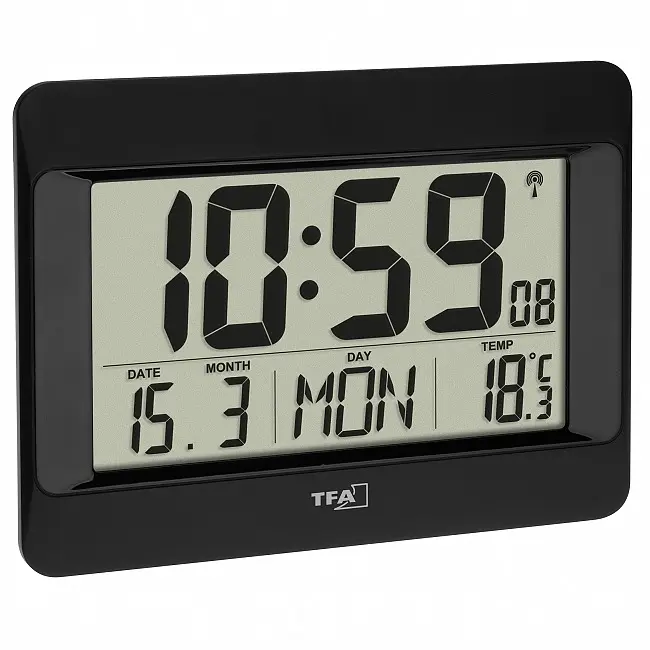 Виробник: TFA Dostmann GmbH & Co.KG, Germany Особливості: Високоточний радіокерований годинник Температура у приміщенні Будильник із функцією повтору День тижня 8 мовами та відображення дати Можливість ручного налаштування та часовий пояс Відображення секунд або календарного тижня Ідеально підходить для дому, офісу, залу очікування, передпокою та як подарунок Настінний монтаж або настільна підставка Зареєстрований дизайн TFA Жодна лікарська практика, конференц-зал, приймальня або зона очікування не обходиться без нього: великого, легко читаного та простого цифрового годинника на стійці реєстрації або на стіні. Час встановлюється з точністю до секунди за допомогою сигналу DCF77, а перехід із зимового часу на літній відбувається автоматично. На додаток до дня тижня також відображається кімнатна температура. Якщо календарний тиждень для вас цікавіший, ніж секунди, то змініть відображення на постійній основі. Крім того, пристрій має також всі властивості та функції будильника.