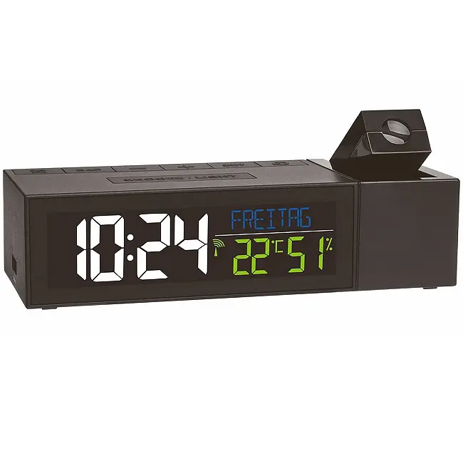 Виробник: TFA Dostmann GmbH & Co.KG, Germany Особливості: Цифрова проекція на стіну або стелю поточного часу Високоточний радіокерований годинник (DCF77 - сигнал) Відображення дати або дня тижня, написаних повними буквами (6 мов) Індикація температури і вологості в приміщенні Будильник з таймером дрімоти Функція повтору будильника з регульованим інтервалом Кольоровий дисплей з 5 рівнями яскравості Функція зарядки для мобільних пристроїв через USB-порт (1А) Блок живлення у комплекті Зареєстрований дизайн TFA З керованим по радіо проекційним будильником «SHOW» вам більше ніколи не доведеться шукати потрібну кнопку вночі, так як радіокерований годинник проектує даний час на стіну або стелю вашої спальні. Кольоровий дисплей показує не тільки поточний час, але також повними буквами дату і день тижня, які ви можете вибрати між 6 мовами. Яскравість дисплея можна регулювати (5 рівнів). Крім того, відображаються температура і вологість у приміщенні, так що ви можете активно контролювати клімат в приміщенні з допомогою цільового опалення та вентиляції. Крім цих корисних спеціальних функцій, пристрій також виконує всі функції радіокерованого будильника: будильник вчасно вас будить, але завдяки функції повтору з регульованим інтервалом ви можете отримати додатковий сон ще на кілька хвилин. Вбудована функція таймера дрімоти надійно розбудить вас після короткого сну. Особливістю тут є вбудована функція зарядки для пристроїв з USB-портом.