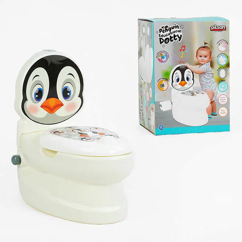 Горшок выполнен в форме унитаза и имеет анатомическую форму, которая обеспечит малышу комфорт и удобство, а отцу - быструю уборку и чистку. Горшок оборудован съемной спинкой, имеющей фигурную форму и яркую наклейку с изображением пингвина. Слив имитирует встроенная кнопка с эффектами, воспроизводит реалистичный шум воды и подсвечивается разными цветами во время активации. Унитаз оснащен местом для съемного горшка, который легко вставляется и вынимается за счет вылитых отверстий с обеих сторон унитаза. Также в качестве реалистичного дополнения туалет оборудован крышкой, а сбоку встроен выдвижной держатель для туалетной бумаги. Размер унитаза со спинкой – 39х37.5х24 см. Высота сиденья от пола – 22 см. Размер съемного горшка – 22х26х6.5 см. Максимальный вес – 25 кг. Рекомендуемый возраст – 18 месяцев.