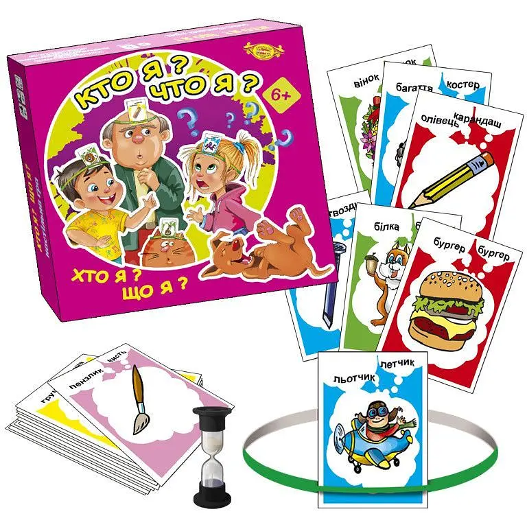 Игрок надевает на голову обруч, в который вставляют карточку с картинкой. С помощью вопросов, на которые можно отвечать Да или Нет, он угадывает, КТО или ЧТО изображено на карте. Песочные часы отмеряют время. Если игрок за оговоренное время угадывает, КТО он или ЧТО он, - карточку забирает себе. Чем больше карт - тем ближе победа.