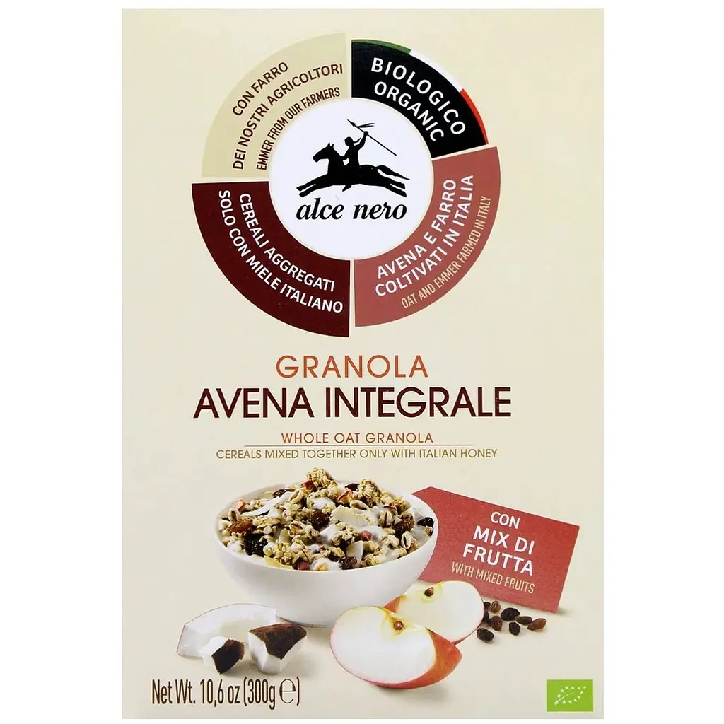 Органическая овсяная гранола Alce Nero с фруктовым миксом идеально подходит для завтрака. Она изготовлена из итальянского цельнозернового овса и эммера, выращенного фермерами. Овсяные хлопья и слоеный эммер смешиваются с рассыпчатым рисом без добавления растительных масел. Для соединения зерен используется смешанный цветочный мед без каких-либо других дополнительных ингредиентов. В завершение добавляется смесь органических сушеных фруктов: изюм, кусочки кокоса и маленькие кусочки яблока.