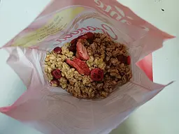 Гранола - хрустка випечена суміш цільнозернової вівсянки та ягід. Корисний поживний сніданок. Здорове харчування. Легке приготування, навіть дитина впорається, якщо зголодніла. Просто насипати в тарілку та залити молоком, йогуртом або кефіром. Я заливаю окропом, потім додаю вершки. З мінусів: наявність цукру та пакування без зіп-застібки. Загалом це якісний продукт за свою ціну, але варто пересипати в герметичну ємність після відкриття.