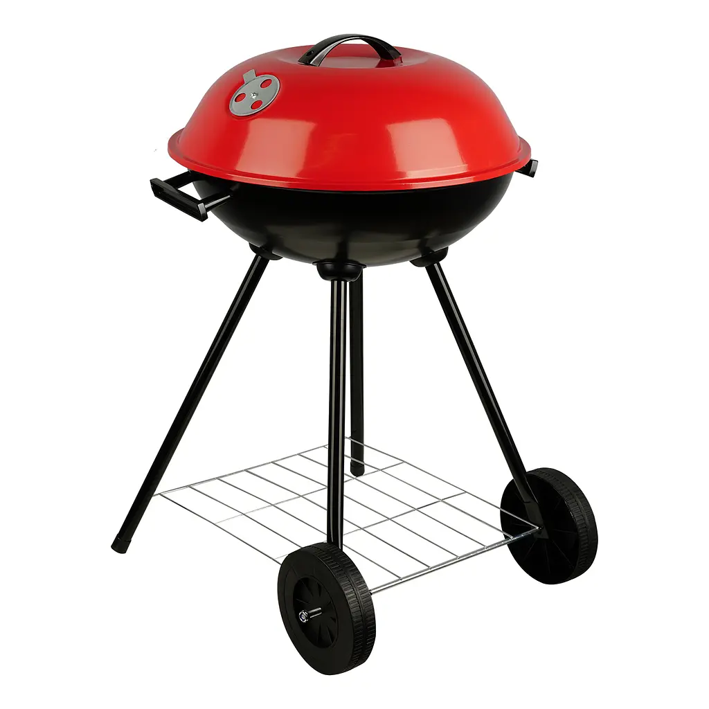 Легко перемещается благодаря колесам и бакелитовым ручкам. Крышка с рукояткой позволяет поддерживать оптимальную температуру приготовления. Усиленная конструкция с металлическими ножками обеспечивает стойкость и долговечность.