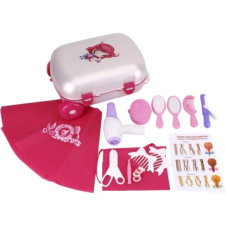 Комплектация: чемодан, фен, плойка, расческа, щетка, зеркальце, 2 заколки, пудреница, пинцет, ножницы, накидка, пояс, 4 резинки для волос, инструкция для заплетания.