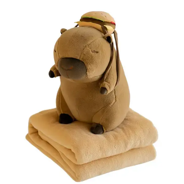 Игрушка-подушка в виде капибара смотрится мило и оригинально благодаря продуманному дизайну. Она выполнена в спокойных природных оттенках, имеет округлую форму, небольшие ушки и аккуратную мордочку с дружелюбным выражением. Особый шарм добавляет рюкзачок в виде гамбургера, что создает игривый акцент и делает игрушку более интересной как для детей, так и для взрослых.
