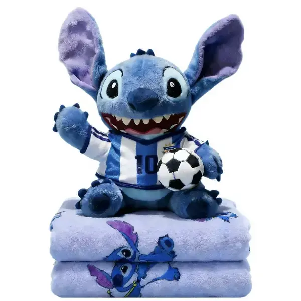 Игрушка-подушка «Стеч с мячом и пледом» сочетает в себе функциональность и приятный внешний вид. Мягкая игрушка выполнена в виде персонажа с большими ушами и выразительными глазами, одетого в спортивную футболку с номером 10 и футбольным мячом. Внутри игрушки предусмотрен скрытый пледный отсек, что позволяет компактно хранить его без лишнего места.