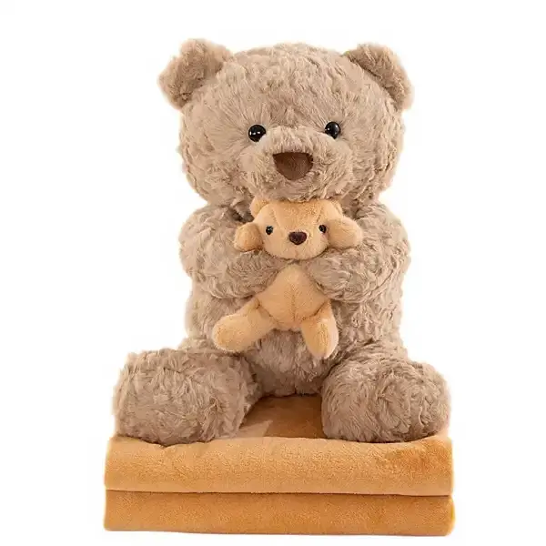 Мягкая игрушка в виде мишки выполнена из приятного на ощупь плюша. Мишка имеет округлую форму, аккуратные ушки, маленькие черные глаза и более темный носик, что придает ему выразительность и уютный вид. В кавычках он держит маленького мишку, что подчеркивает декоративность изделия и делает его особенно привлекательным для детской комнаты или подарка.