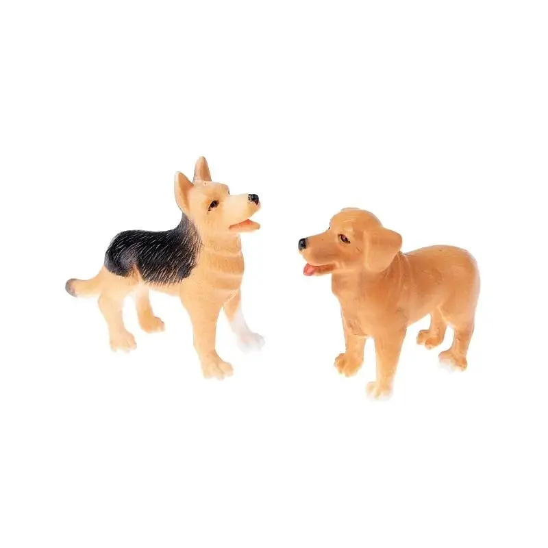 Две собаки – немецкая овчарка и золотистый ретривер. Прекрасно подойдут как для веселой игры, так и для пополнения коллекции собачек разных пород. Кроме того, могут играть роль обычной куклы: катание в коляске или на машинке, укладывание спать. С такими фигурками собак ребенок сможет организовать настоящий домашний зоопарк, а также придумать множество интересных сюжетов для дальнейших игр. Благодаря таким игрушкам ребенок учится заботиться о ближних. Фигурки обладают рельефной поверхностью, за счет этого способствуют развитию мелкой моторики ребенка. Рекомендуется для игры от 3 лет.