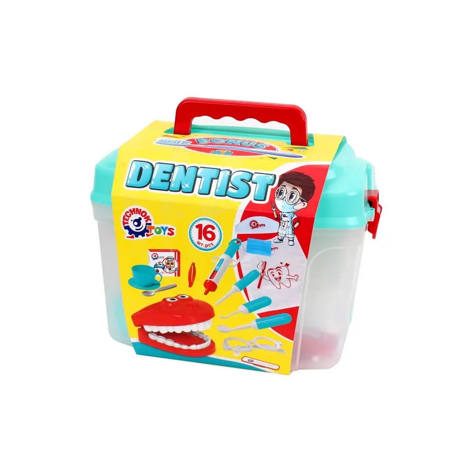Как научить детишек правильно чистить зубки? Это действительно ответственное и важное задание для всех родителей. И на помощь вам новинка - "Набор стоматолога" в саквояже. А для всех малышей подарок — настоящая детская зубная щетка. Теперь мальчики и девочки с восторгом будут учиться ухаживать за своими зубками и лечить их любимым игрушкам. А соблюдать все правила гигиены в "стоматологическом кабинете" поможет специальная накидка врача, шапочка и, главное, защитная маска. Так малыш точно почувствует себя настоящим врачом. В наборе профессиональные стоматологические инструменты: бур, зеркало и зонд, а также шприц, пинцет, очки, бейдж, коробочка "с таблетками", нумерация зубов и чашка с ложечкой на тарелочке. И конечно, самое интересное — модель челюсти. Теперь все зубки можно тщательно осмотреть и хорошо полечить. Игрушка «Набор стоматолога» поможет детям научиться ухаживать за своими зубками и преодолеть страх перед посещением стоматологического кабинета. Набор станет прекрасным подарком для каждого малыша. Игрушка изготовлена из прочного качественного Пластика без запаха. Для детей от 3-х лет. В комплекте бонус — детская зубная щетка. Упаковка — удобный саквояж с ручкой и замками.