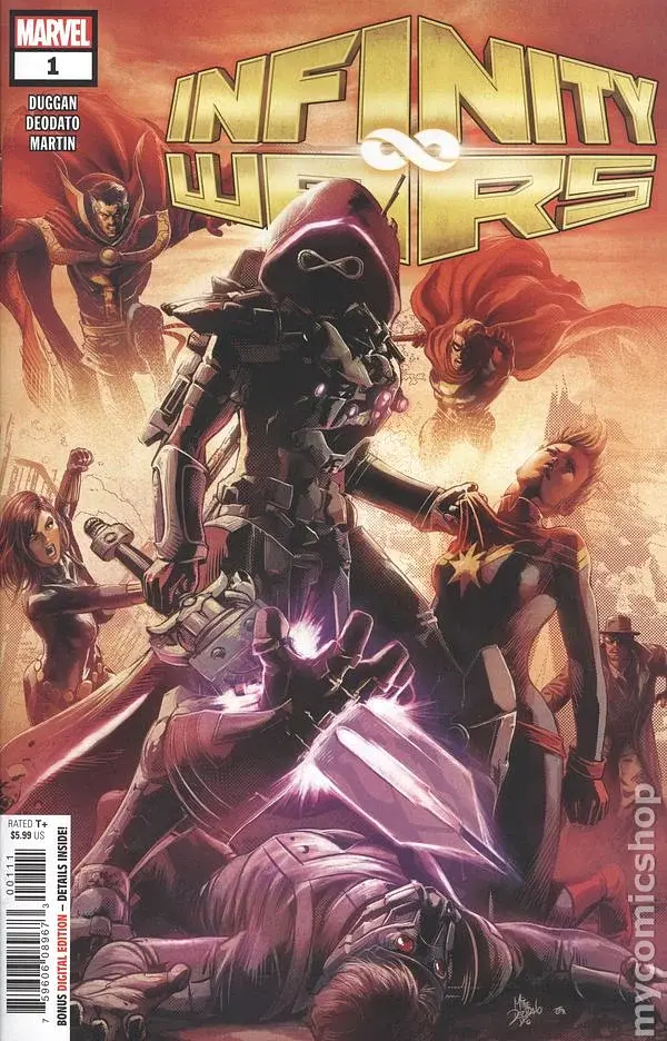 Written by Gerry Duggan. Art and Cover by Mike Deodato. As the Infinity Stones come to Earth, so too comes the war for control over them. But none who wield the stones know the truth about the power they contain…or what it would take to bring them to their END. The nature of the universe itself hangs in the balance as we learn the answer to the question on everyone's lips since 'Infinity Wars Prime': WHO IS REQUIEM? Gerry Duggan (DEADPOOL, INFINITY COUNTDOWN) and Mike Deodato Jr. (ORIGINAL SIN, OLD MAN LOGAN) look into the Infinite and bring the truth to light! 56 pages, full color. Rated T+ Cover price $5.99.