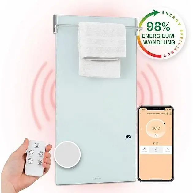 Инновация для хорошего настроения: инфракрасный обогреватель Klarstein Hot Spot Crystal Spotless Smart приносит приятное здоровое тепло в ванную комнату и сохраняет уютные теплые полотенца для вас. Элегантная нагревательная панель очень плоская, ее можно повесить прямо на стену. Вы также можете разложить встроенную вешалку для полотенец, чтобы ваши банные полотенца всегда были красивыми, теплыми и уютными. С мощностью 750 Вт благодаря инфракрасному обогреву ComfortHeat он использует принцип солнечного тепла и непосредственно нагревает предметы и людей инфракрасными лучами. Полные 95% потребляемой энергии преобразуются в тепловые лучи энергосберегающим способом.