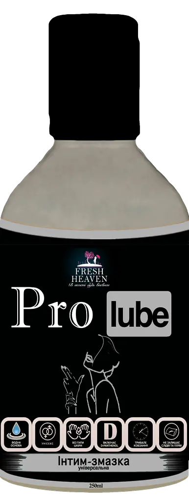 Интим-смазка (лубрикант) “Pro Lube” ТМ “Fresh Heaven”, базируется на водной основе, для универсального (анально-вагинального) применения. Средство прозрачное на вид и подходит для всех типов кожи. Обладает нейтральным вкусом, ароматом и мягким уровнем pH. Уникальная рецептура продукта разработана в лаборатории Германии, что гарантирует высокое качество готовой продукции.
