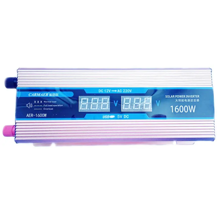 Автомобильный инвертор преобразователь Carmaer Power Inverter мощностью 1600W - это портативное устройство, предназначенное для зарядки и работы: ноутбуков, видеокамер, телефонов, аудио- и видеотехники и других электроприборов в условиях, где нет сетевых источников питания. Устройство оснащено дисплеем для отображения работы, розеткой для подключения приборов, USB-портом и кнопкой переключателя. Охлаждение инвертора постоянно и производится с помощью кулера, установленного на задней панели прибора.