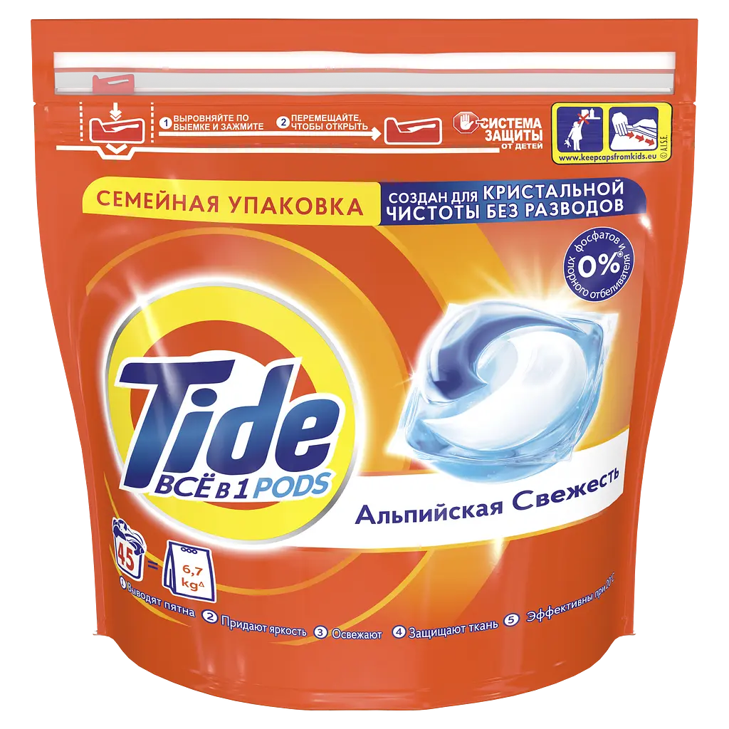 Капсулы для стирки Tide (Тайд) Все-в-1 Альпийская свежесть придают вещам невероятную чистоту, благодаря всего лишь одной маленькой капсуле.