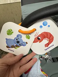 Яскраві картки з тваринками, мають надруковані кольори та принти, дитина добре може самостійно гортати. Прикріпила на бампер візочка, легко зняти відкріпивши кільце. Також можна перемішувати при бажанні у відповідному порядку.