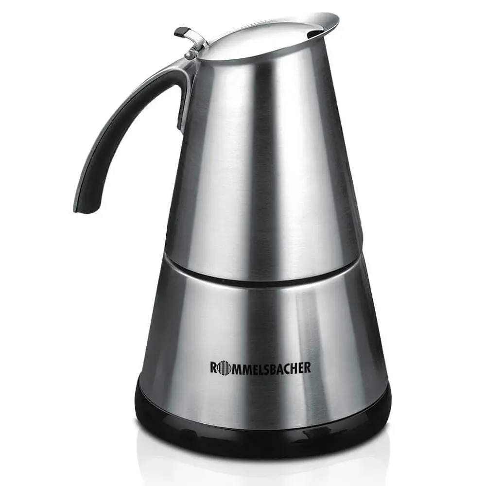 Нравится всем - оригинальный итальянский эспрессо. ROMMELSBACHER Espresso Maker ElPresso mini предлагает лучшие условия для немного меньшей жажды кофе. Визуально привлекает внимание: совершенный дизайн из высококачественной нержавеющей стали и эргономично изогнутая ручка из нержавеющей стали с теплоизоляционным пластиком внутри. Независимо от того, 4 чашки или - благодаря входящему в комплект фильтрующему элементу - всего 2 чашки эспрессо, работа проста и удобна. Налейте воду и порошок эспрессо, поставьте беспроводной кувшин на центральное основание, включите и выключите. Как только эспрессо будет готов, устройство автоматически выключится. Просто отлично!