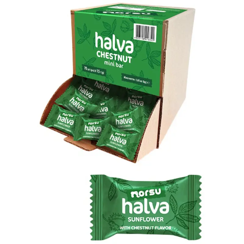 Халва подсолнечная Norsu с ароматом каштана – это вкусная конфета из халвы, изготовленная из натуральных подсолнечных семян и дополненная ароматом каштана.