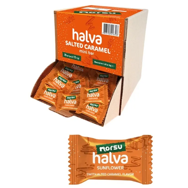 Халва подсолнечная Norsu со вкусом соленой карамели – это вкусная конфета из халвы, изготовленная из натуральных подсолнечных семян и дополненная вкусом соленой карамели.