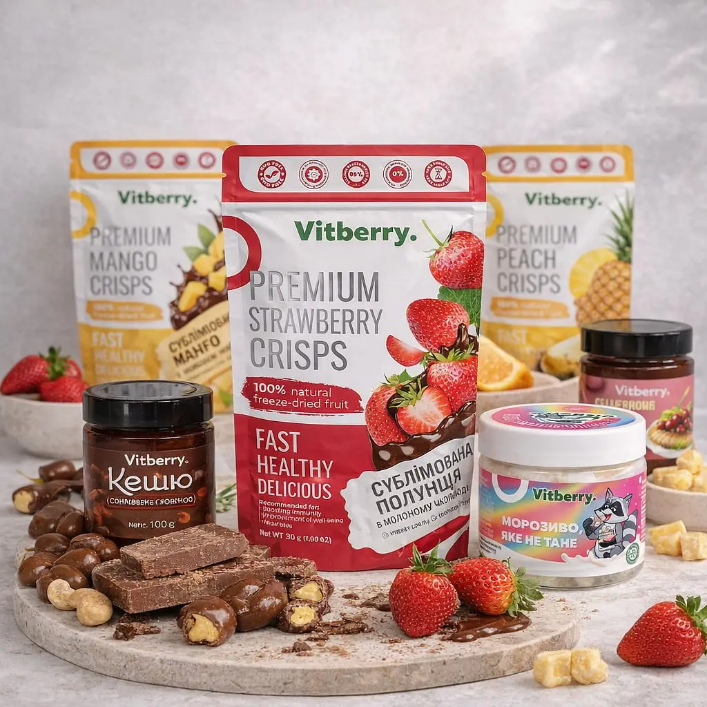 Дегустационный микс Vitberry — это собрание натуральных снеков, изготовленных по технологии вакуумной сублимации. Мы используем только отборное сырье: 100% натуральные фрукты и ягоды, орехи высшего сорта и настоящий молочный шоколад без заменителей какао-масла. Продукты сохраняют форму, цвет и до 95% витаминов свежих фруктов.