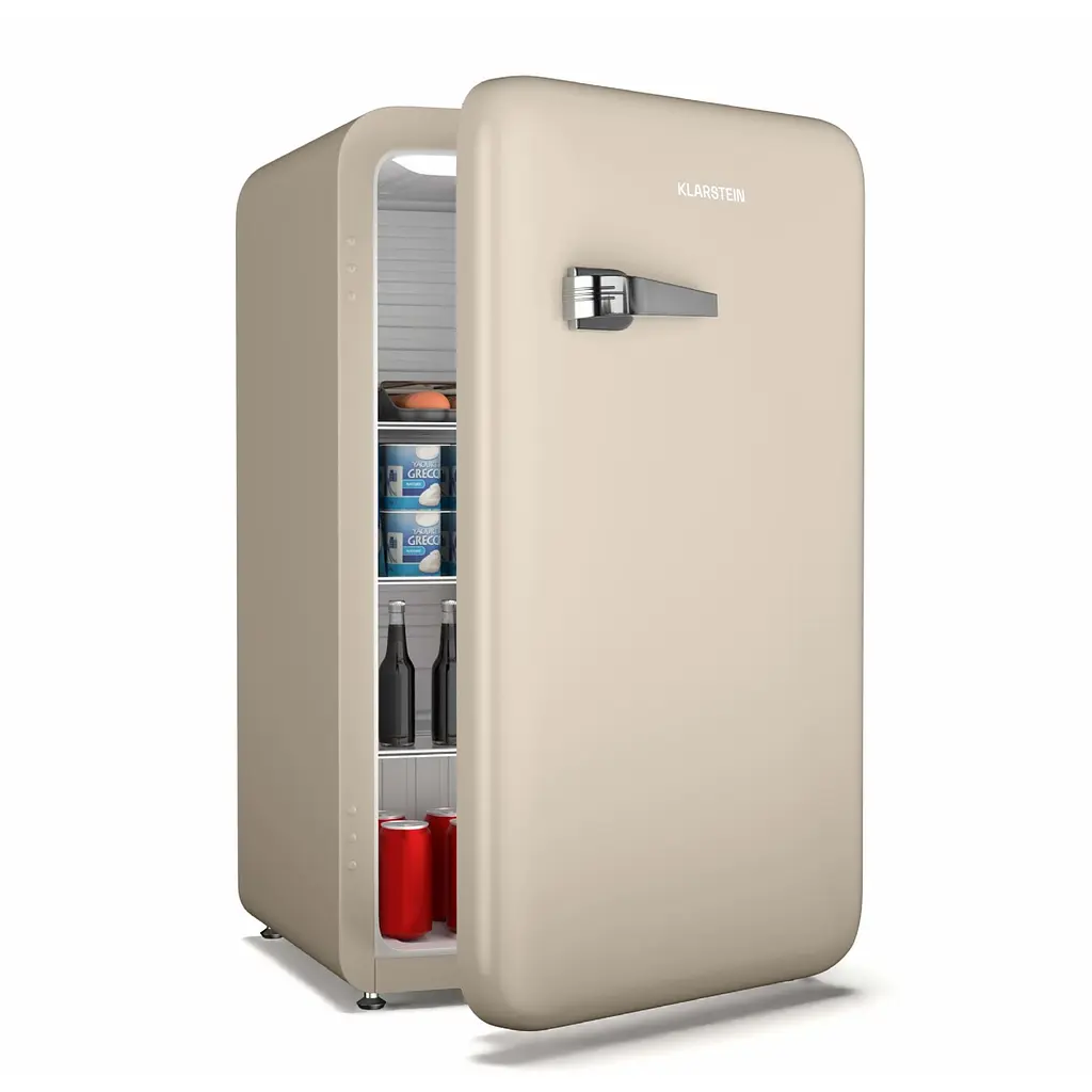 Винтажный дизайн привнесёт нотку ностальгии в любую обстановку. Холодильник оснащён мощной компрессорной системой охлаждения и позволяет точно регулировать температуру от 0°C до 10°C благодаря механическому термостату. Уровень шума всего 40 дБ, что делает его достаточно тихим, чтобы не мешать вашему отдыху или работе.