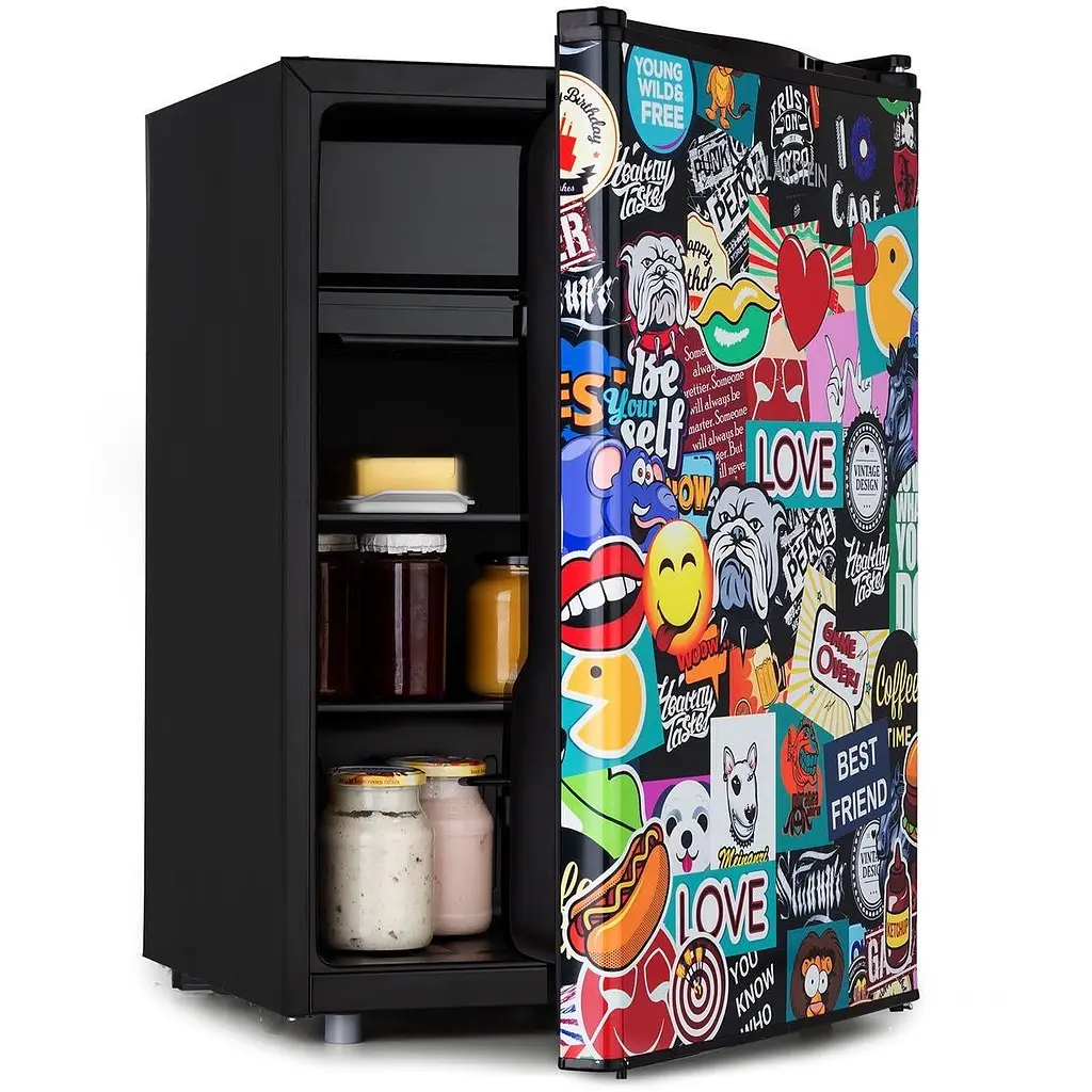 Комичный супергерой среди компактных холодильников! Холодильник Klarstein Cool Vibe 70+ объемом 72 литра имеет достаточно места для любой еды. Два дверных отделения обеспечивают необходимое пространство для хранения бутылок и стаканов. Кроме того, в отдельном отделении для льда наверху всегда готовы кубики льда, замороженные продукты или мороженое.