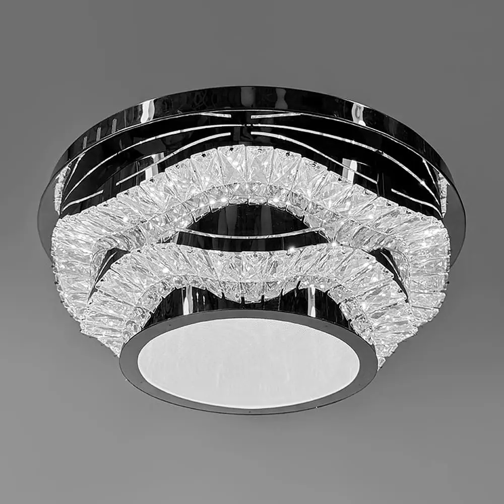 Современная серия потолочных люстр с хромированным корпусом и прозрачным хрусталем - это удачное сочетание элегантности и технологичности. Благодаря блестящей металлической основе и ограненным хрустальным элементам свет красиво преломляется, создавая глубокую игру бликов и добавляя интерьеру нотки роскоши. Все модели имеют встроенные светодиоды с тремя режимами освещения - теплым, холодным и нейтральным. Также они дополнены ночником, который дарит мягкий фоновый свет в вечернее время. Серия представлена в четырех размерах: Ø 33 см - мощность 76 Вт (38 Вт - теплый и холодный свет, 8 Вт - ночник) Ø 39 см - мощность 92 Вт (56 Вт - теплый и холодный свет, 3 Вт - ночник) Ø 50 см - мощность 110 Вт (65 Вт - теплый и холодный свет, 10 Вт - ночник) Ø 58 см - мощность 150 Вт (74 Вт - теплый и холодный свет, 14 Вт - ночник) Благодаря разным размерам, люстры можно подобрать как для небольшой спальни, так и для просторной гостиной, сохраняя стильную целостность интерьера. Тип цоколя: 20 Форма_изделия: Круг Тип помещения: Люстры для гостиной (в зал) Режим ночника: Есть Серия: C 1784 Цвет основы: Хром Цвет фурнитуры: Хром Размер потолочной основы: 58х4 см Цветовая температура: 3000–4500–6000К Материал основы: Металл Размер монтажной планки: 37 см Тип крепления: Крестовина Мощность (Вт): 150 w