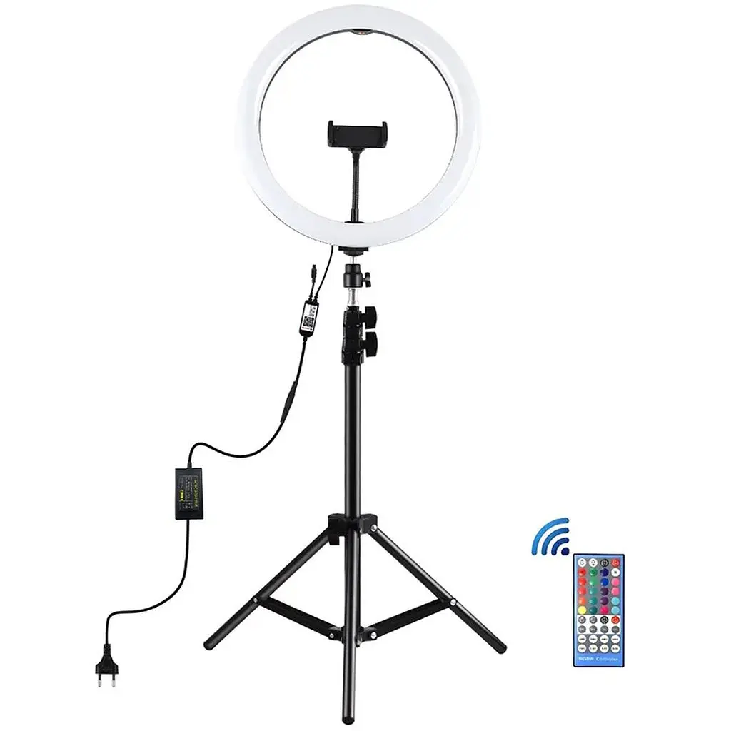 Штатив:1. Изготовлен из высококачественной алюминиевой трубки, надежен и прочен. Компактные ножки штатива можно сложить, сделав их достаточно маленькими для удобной переноски. Отрегулируйте высоту штатива, отрегулировав центральную ось в соответствии с разными концепциями съемки.4. Подходит для мобильных телефонов, планшетов, спортивных камер, DV камер и др.5. Легкий и портативный дизайн: удобно использовать для путешествий или работы на открытом воздухе и т.д.6. Высота в сложенном виде: 49,5 см; в разложенном виде: 1,1 м. Светодиодное кольцо:1. Светодиодный кольцевой светильник можно установить на держатель и взять с собой куда угодно, его можно снять со стойки в любое время, шаровая головка штатива может вращаться на 360 градусов и может свободно регулироваться под любым углом.2. Кольцевой светильник изготовлен из 75 энергосберегающих светодиодов. Он отлично рассеивает тепло, обладает постоянным током и высокой цветопередачей, смягчает источник света и повышает тон кожи при съемке портретов.3. Режим RGB позволит легко настроить цвет и яркость и достичь идеальной яркости без установки дополнительных красочных фильтров. Различные цвета мягкого природного света освещают вашу красоту в разных условиях. Широкое применение: широко используется для освещения на улице, в помещении, для съемки портрета, рекламной фотографии, визажа/макияжа, съемки видео и т.д.5. Легкий и портативный дизайн: удобно использовать и носить с собой, когда вы путешествуете или работаете на улице и т.д.6. Зажим телефона подходит для мобильного телефона шириной 5,7-9 см. Технические характеристики: Светодиоды: 75 шт. SMD 5050 RGBWМощность: 30ВтРежим работы: RGB+WhiteРежимы управления: Bluetooth APP, пульт дистанционного управленияРежимы дистанционного управления:20 статических цветов и 6 динамических цветовРежим работы с ПО: 5-10 мМетод сигнала: инфракрасная радиочастотаЦвет:- Красный: длина волны 620-625 нм, световой поток 600 мкд/лм- Зеленый: длина волны 520-525 нм, световой поток 10 460-465 нм, световой поток 400 мкд/лм- Белый: цветная температура 6000-6500kРазмер светодиодного кольца: 30х30 см (30х35 см с креплением)Вес в упаковке: 1,53 кгГарантия: 12 месяцев телефонаШтативПульт дистанционного управления